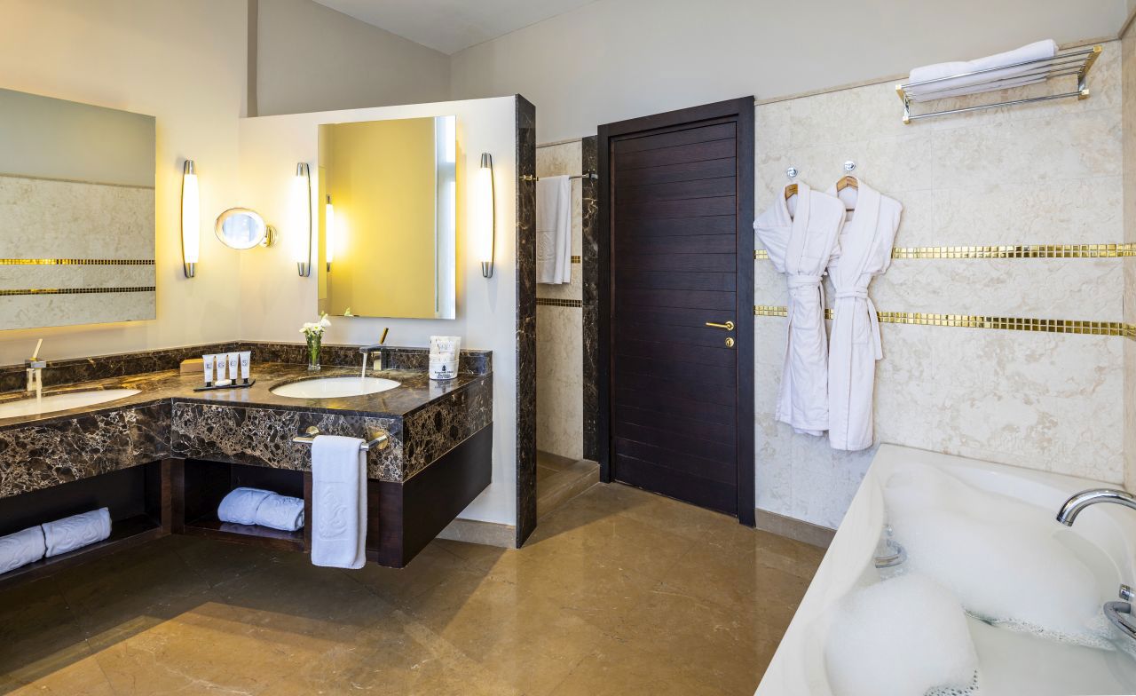 Luxurious bathroom with exclusive bath amenities by Dyptiqe-Sultan Bar Set-up-Wine cooler-VIP Guest Relation Assistant (Between 08:00-00:00)-Check-in and check-out at the villa-Welcome drink and cold towel upon arrival-Turn down service-Dining will be available 24 hours in the villa as per the menu-VIP welcome set-up upon arrival-Iron and iron board -Complimentary beach or pier cabana-Complimentary A’la Carte dining -Buggy on private use-Children sized bathrobes and slippers-Warm milk before bedtime-Babysitting service-Special menu for kid