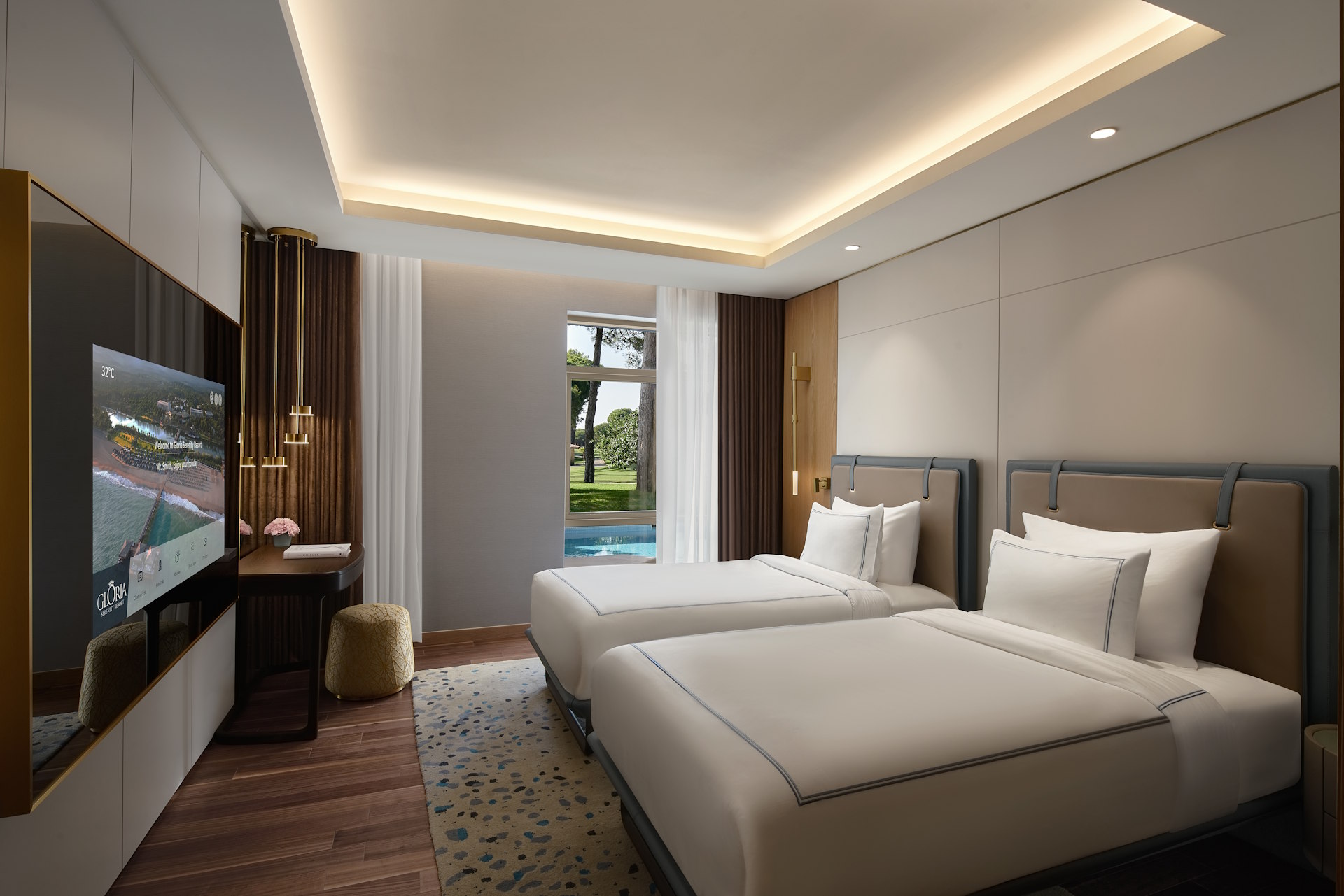 This 200 m² Deluxe Villa offers refined luxury with a private garden, terrace, and views of the pool and golf course, providing an exceptional setting for a distinguished golf retreat. Designed as a spacious duplex, it accommodates up to 6 adults and 2 children, featuring three elegantly appointed bedrooms, a sophisticated living and dining area, and four luxury bathrooms with premium amenities. Guests enjoy a private heated seawater pool, advanced in-room technology, personalized comfort features, and exclusive services, ensuring a serene and prestigious accommodation experience